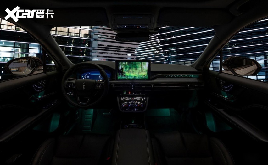 启动“森林绮境”模式后,中控屏幕会显示树影婆娑的画面,车舱氛围灯也会发出绿色柔光,同时星光饰条闪烁着点点星光。另外,林肯香氛系统会释放出森林一般的清新气息,锐威音响演奏出舒缓的音乐,全体感尊享座椅则自动开启按摩功能。